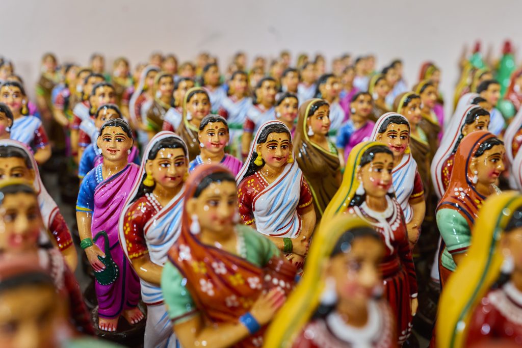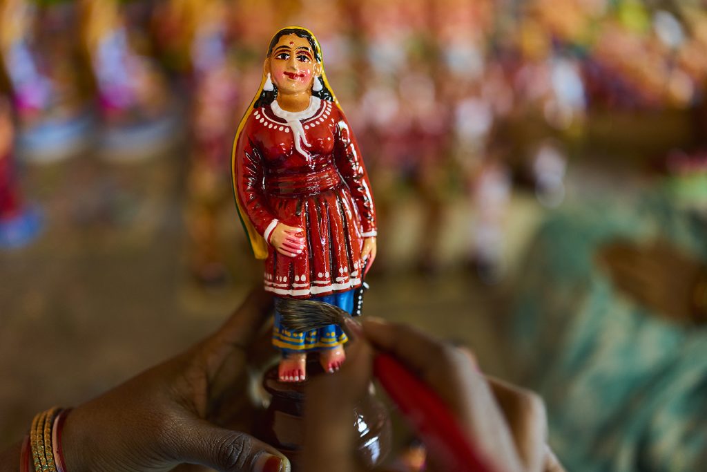 Even today, the craft remains largely handmade. The shaping, joining, drying, and painting of each figure requires careful manual work. This approach preserves the individuality of each piece. No two dolls are exactly identical because each artisan brings subtle differences in proportion, expression, and colour.