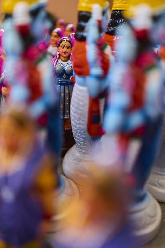 The figures follow established visual traditions. The colour of Shiva, the posture of Rama, the iconography of Lakshmi or Saraswati all adhere to forms that have been preserved over centuries. In this way, Golu dolls act as small visual archives of cultural memory.