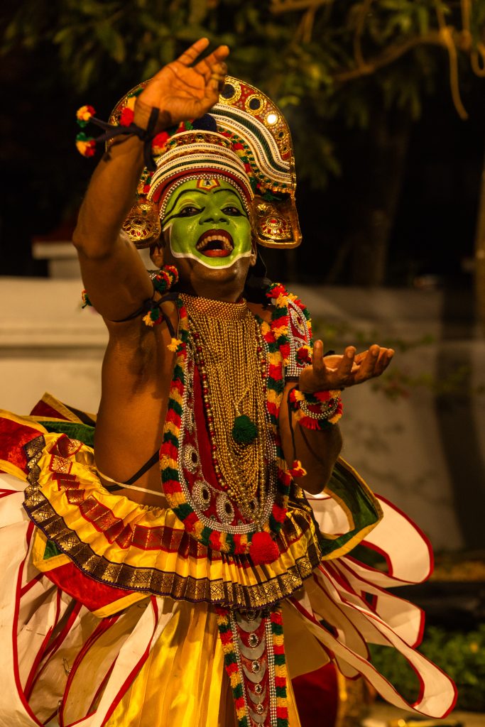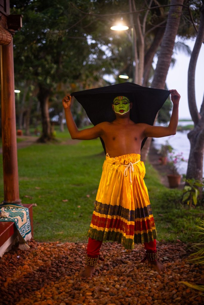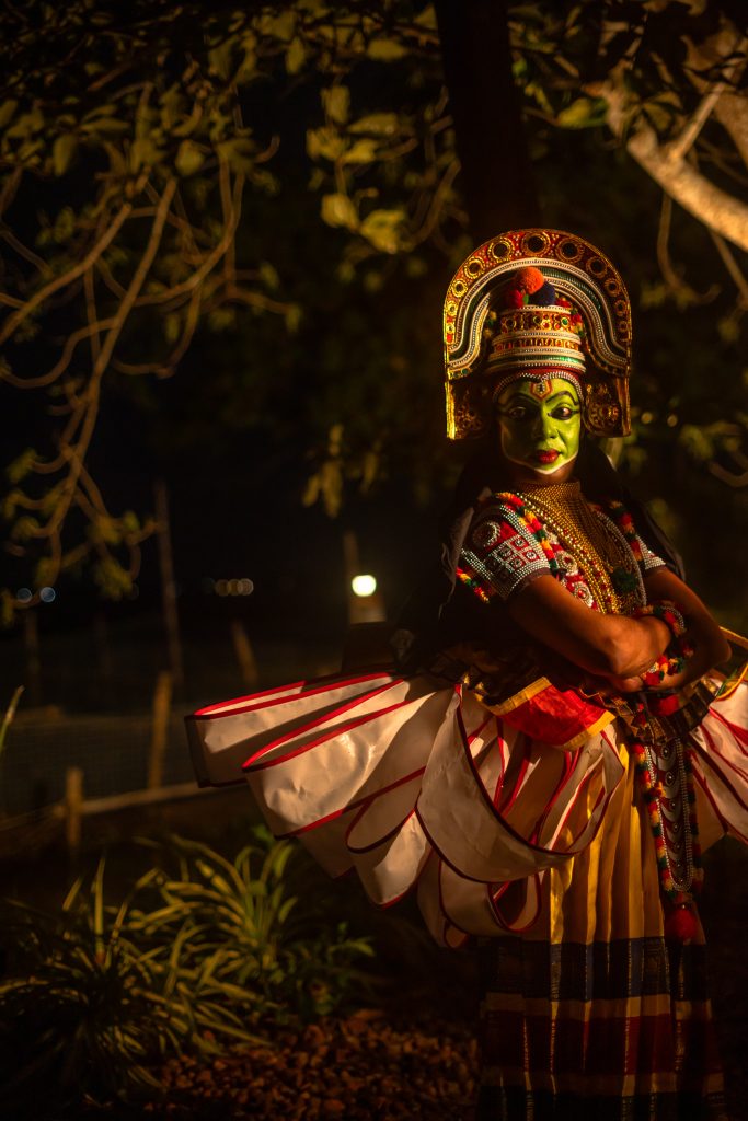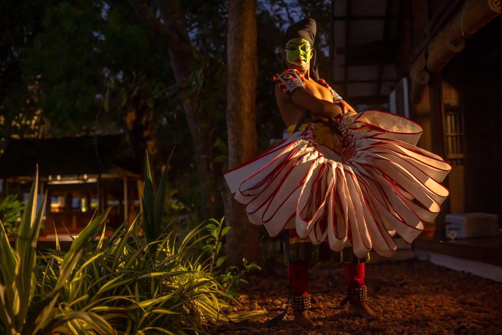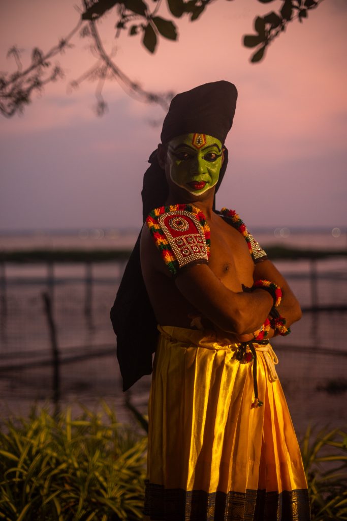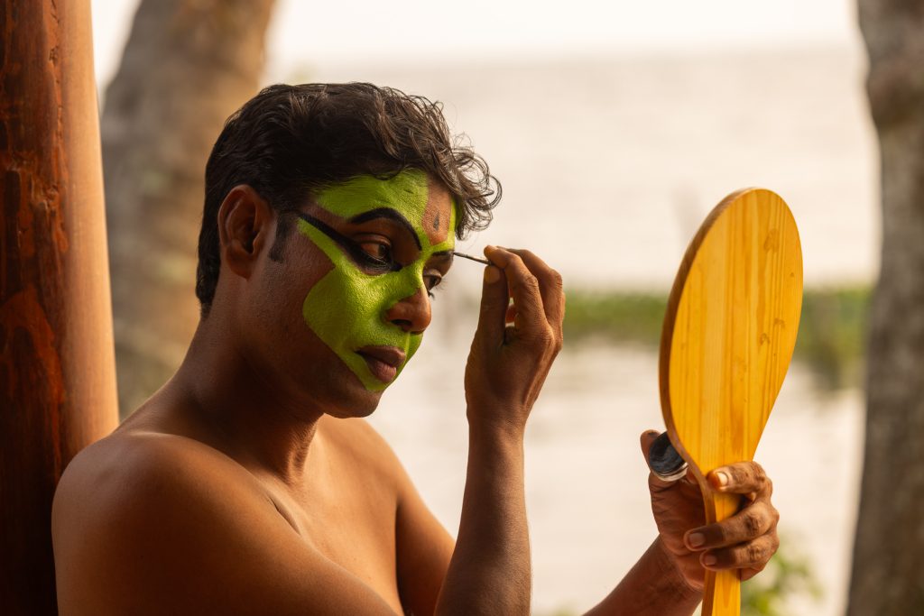 Backstage before a performance Kannan prepares in near silence. The costume is elaborate yet purposeful. Around his waist sit layers of bright ornaments and pleated fabric. The face carries the signature colours of the form. Green dominates the base while white highlights sharpen the contours of the eyebrows and cheeks. Red and black accentuate the lips and eyes.
